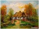 Na obrazie widzimy urokliwą scenę wiejską chatę pośród malw . Dominuje tu złocisty odcień strzechy i intensywna ...