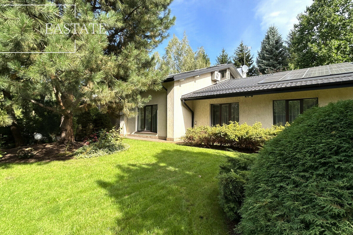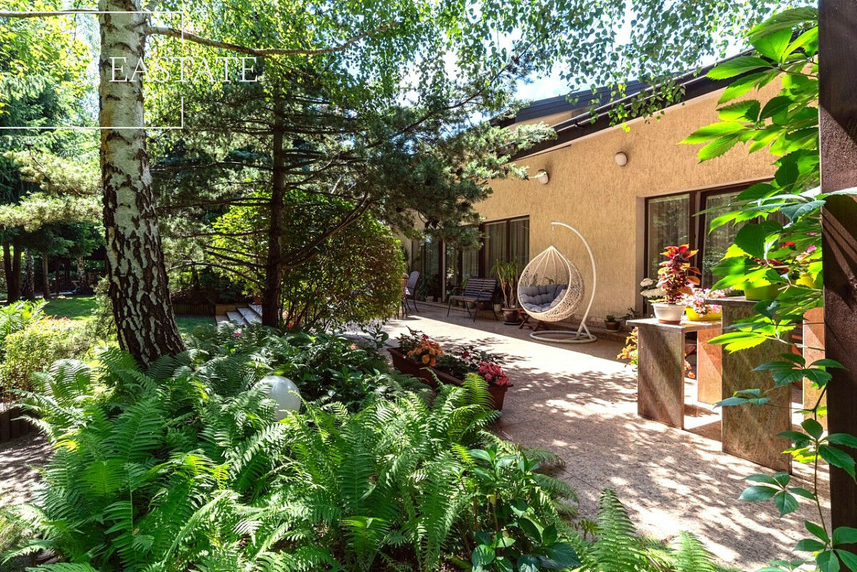 Ogród należy do przestrzeni wyjątkowo zadbanych i zazielenionych. Dzięki bardzo dużej ilości roślin, w tym obecności drzew wysokich, w jego przestrzeni zawsze odnaleźć można liczne zacienione fragmenty. Doskonale łączy się on również z rozległymi tarasami przynależącymi do domu. Działka o wymiarach 50 x 75 metrów posiada również system automatycznego nawadniania, który zasilany jest wodą pochodząca z własnej studni.